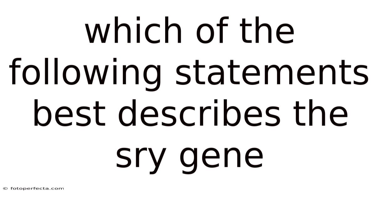 The SRY gene, located on the short arm of the Y chromosome, encodes a protein known as the sex‑determining region Y‑linked protein (SRY‑protein). Worth adding: this protein belongs to the SOX family of transcription factors, which bind to specific DNA sequences and regulate the expression of downstream genes. In the presence of a functional SRY gene, the embryonic gonad differentiates into testes, leading to the cascade of hormonal and cellular events that produce male phenotypes. Conversely, the absence or inactivation of SRY results in default female development. Which means, when asked which of the following statements best describes the sry gene, the correct answer must reflect its role as the primary trigger for male sex determination in vertebrates.